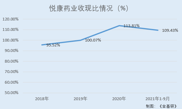 据东方财富choice数据,2018-2020年及2021年1-9月,悦康药业的收现比分别为95.52%、100.07%、113.81%、109.43%。