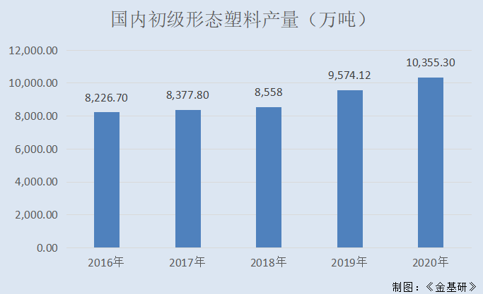 2016-2020年,国内初级形态塑料产量分别为8,226.7万吨、8,377.8万吨、8,558万吨、9,574.12万吨、10,355.3万吨。