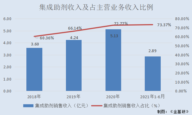 2018-2020年及2021年1-6月,风光股份集成助剂收入分别为3.6亿元、4.24亿元、5.13亿元、2.89亿元,占主营业务收入比重分别为60.36%、66.14%、72.77%和73.37%。
