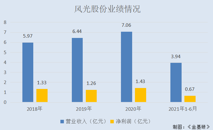 2018-2020年及2021年1-6月,风光股份营业收入分别为5.97亿元、6.44亿元、7.06亿元、3.94亿元,净利润分别为1.33亿元、1.26亿元、1.43亿元、0.67亿元。需要说明的是,2021年上半年风光股份净利润受原材料价格大幅增长影响出现一定程度下滑。
