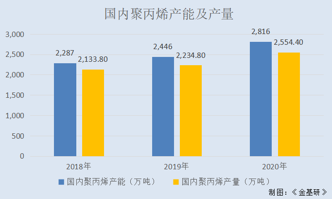 2018-2020年,国内聚丙烯产能分别为2,287万吨、2,446万吨、2,816万吨,产量分别为2,133.8万吨、2,234.8万吨、2,554.4万吨。
