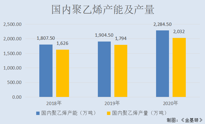 同期,国内聚乙烯产能分别为1,807.5万吨、1,904.5万吨、2,284.5万吨,产量分别为1,626万吨、1,794万吨、2,032万吨。
