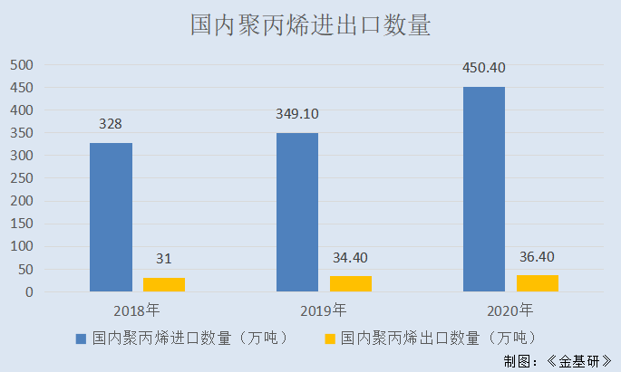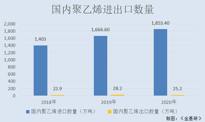 2018-2020年,国内聚丙烯进口数量为328万吨、349.1万吨、450.4万吨,出口数量为31.2万吨、34.4万吨、36.4万吨;聚乙烯进口数量为1,402.5万吨、1,666.6万吨、1,853.4万吨,出口数量为22.9万吨、28.2万吨、25.2万吨。