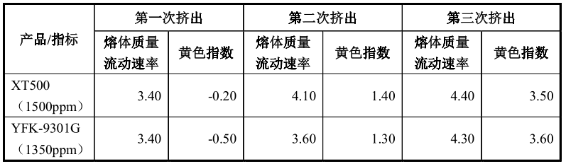 根据中国石化集团北京燕山石油化工有限公司树脂应用研究所树脂检测实验室出具的检测报告,在熔体质量流动速率方面,XT-500在挤出中变化很大,远不如YFK-9301G表现的稳定;在黄色指数控制方面,第一次挤出YFK-9301G表现得更好,第二、三次挤出两者性能相当。