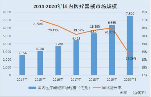 据统计,2014-2019年国内医疗器械市场规模为2,556亿元、3,080亿元、3,700亿元、4,425亿元、5,304亿元、6,365亿元,预计2020年将会达到7,529亿元。