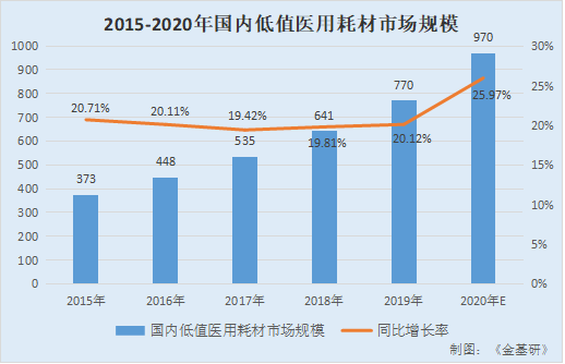 医用耗材是医疗器械行业中市场占比达到32%的重要细分领域,国内行业增速约为20%,预计2020年低值医用耗材市场规模已达970亿元。根据医械研究院数据显示,2015-2020年,国内低值医用耗材市场规模分别为373亿元、448亿元、535亿元、641亿元、770亿元、970亿元。同期,国内低值医用耗材市场规模同比增长率为20.71%、20.11%、19.42%、19.81%、20.12%、25.97%。