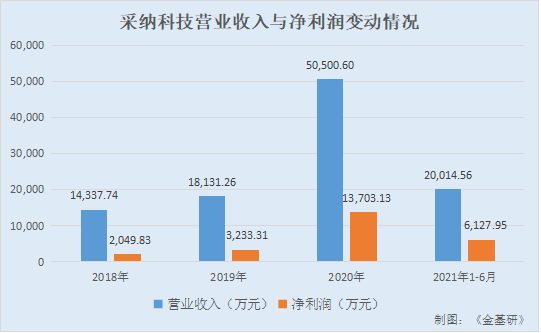 据《金基研》研究,2019-2020年,采纳股份的营业收入增长率分别为26.46%、178.53%,同期,净利润增长率分别为57.74%、323.81%。