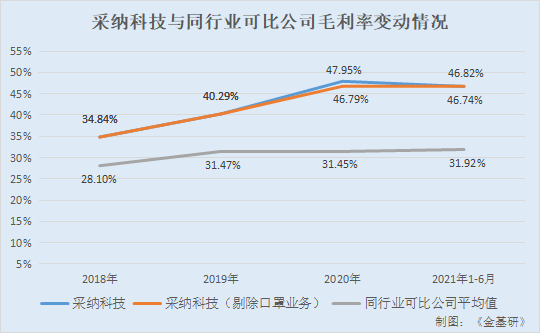 口罩业务系采纳股份是在2020年疫情下的新增业务,剔除口罩业务后毛利率分别为34.84%、40.29%、46.79%、46.82%。