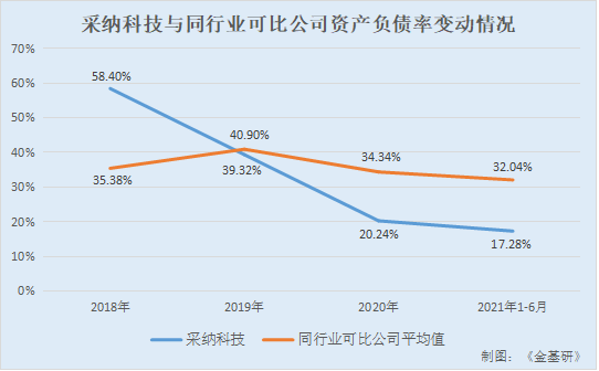 2018-2020年及2021年1-6月,采纳股份资产负债率为58.4%、39.32%、20.24%、17.28%,同期,其同行业可比公司毛利率平均值分别为35.38%、40.9%、34.34%、32.04%。