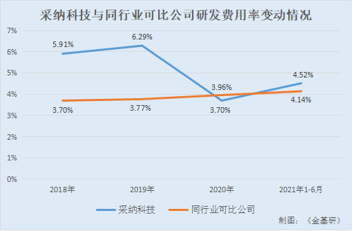 2018-2020年及2021年1-6月,采纳股份研发费用分别为847.23万元、1,140.72万元、1,870.08万元和904.82万元,占营业收入比例分别为5.91%、6.29%、3.7%、4.52%。