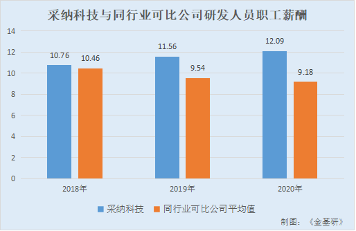 另外,为进一步丰富产品线和保持市场竞争优势地位,采纳股份围绕市场需求持续加大研发投入,研发费用中职工薪酬维持在高水平。2018-2020年,采纳股份研发人员人均职工薪酬为10.76万元、11.56万元、12.09万元。