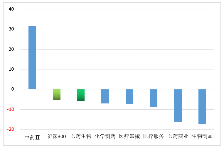 纵观2021年医药生物各子行业,整体呈现高度分化态势。仅中药一个子赛道上涨,涨幅高达31.71%,可谓是“一枝独秀”,其余子赛道均下跌且落后于沪深300指数。