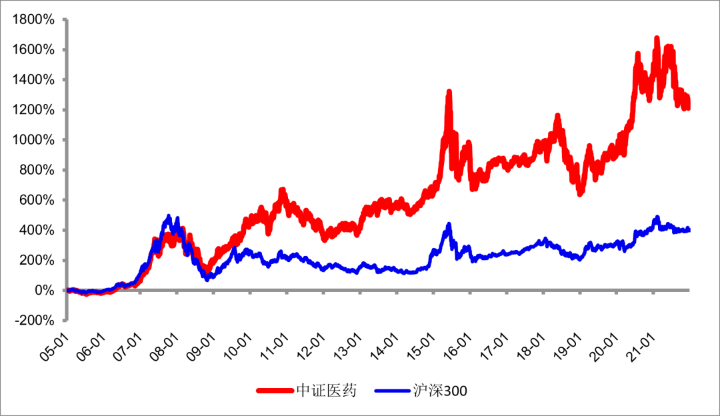 从历史表现来看,2005年以来,沪深300指数经历了震荡、回调、微涨的周期,而医药生物板块涨幅明显,即使曾出现短期回调,过后医药板块仍迎来不同程度的反弹。根据Wind数据显示,17年间同期中证医药指数涨幅高达1246.79%,同期沪深300指数涨幅是402.69%,是沪深300指数涨幅的3倍多。