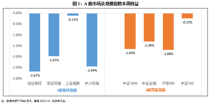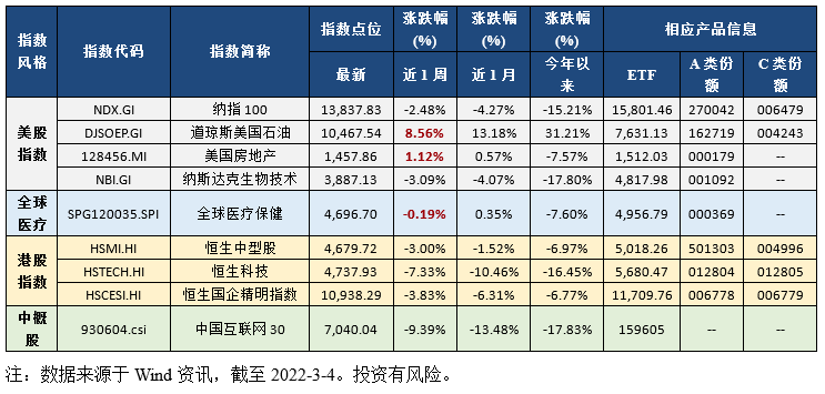 美股方面,美股本周受俄乌局势的影响和加息预期的反复处于震荡下跌走势。全球视角看,俄乌事件具有“滞胀”效应。相比而言,由于欧洲更加依赖俄罗斯的天然气和原油出口,所以欧洲的通胀压力更大,且经济也受到通胀高企影响而下行。而美国的影响主要体现为原油的“胀”,美国经济基本面韧性相对较强。所以对于货币政策而言,美联储为应对通胀而提前收紧货币的速度可能会更快,欧洲相对滞后,因此对美股而言,通胀压力可能更容易体现为估值的调整,加剧市场的不确定性。