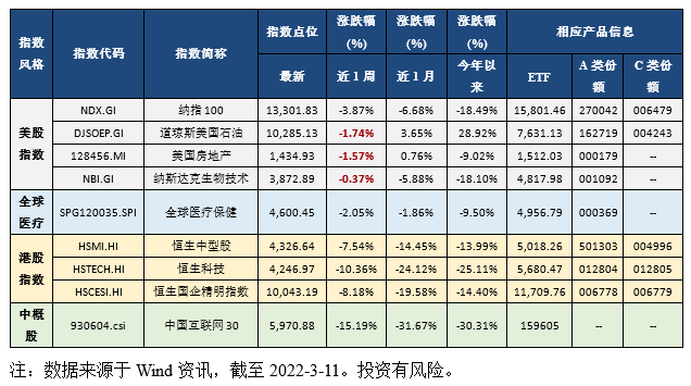 美股方面,美股本周受俄乌局势的影响和加息预期的反复处于震荡下跌走势。全球视角看, 俄乌事件具有“滞胀”效应。相比而言,由于欧洲更加依赖俄罗斯的天然气和原油出口,所以欧洲的通胀压力更大,且经济也受到通胀高企影响而下行。而美 国的影响主要体现为原油的“胀”,美国经济基本面韧性相对较强。所以对于货 币政策而言,美联储为应对通胀而提前收紧货币的速度可能会更快,欧洲相对 滞后,因此对美股而言,通胀压力可能更容易体现为估值的调整,加剧市场的 不确定性。短期核心还是要关注俄乌局势的演变。