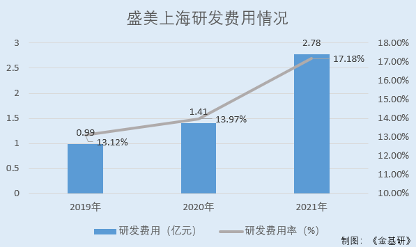 2019-2021年,盛美上海的研发费用分别为0.99亿元、1.41亿元、2.78亿元,占当期营业收入的比例分别为13.12%、13.97%、17.18%。