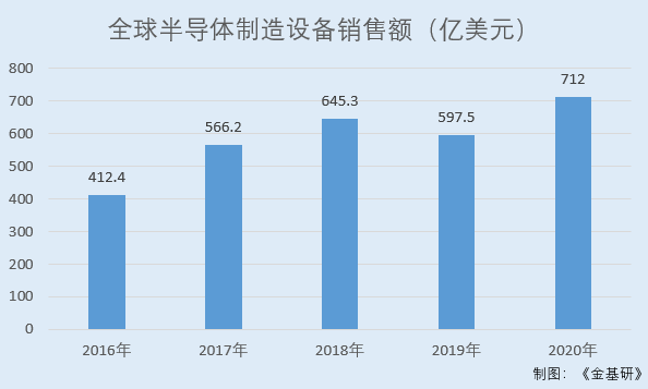 2016-2020年,全球半导体制造设备销售额分别为412.4亿美元、566.2亿美元、645.3亿美元、597.5亿美元、712亿美元。