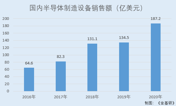 2016-2020年,国内半导体制造设备销售额分别为64.6亿美元、82.3亿美元、131.1亿美元、134.5亿美元、187.2亿美元。