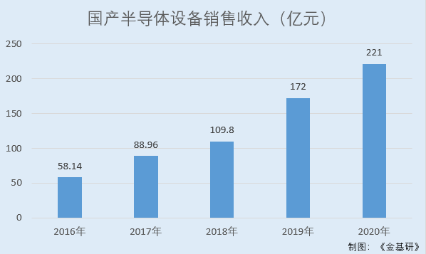 2016-2020年,国产半导体设备销售收入分别为58.14亿元、88.96亿元、109.8亿元、172亿元、221亿元。