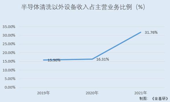 2019-2021年,盛美上海半导体清洗以外设备收入占主营业务收入的比例分别为15.9%、16.31%、31.76%。