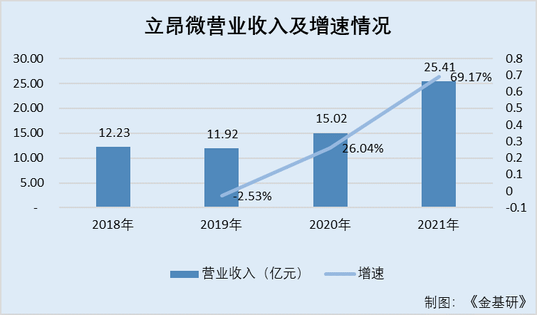 据东方财富Choice数据,2018-2021年,立昂微的营业收入分别为12.23亿元、11.92亿元、15.02亿元、25.41亿元。2019-2021年,营收增速分别为-2.53%、26.04%、69.17%。