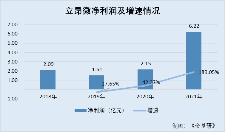 同期,立昂微的净利润分别为2.09亿元、1.51亿元、2.15亿元、6.22亿元。2019-2021年,净利润增速分别为-27.65%、42.37%、189.05%。