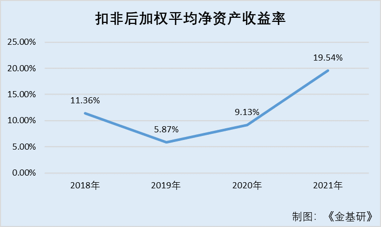 据东方财富Choice数据,2018-2021年,立昂微扣非后加权平均净资产收益率分别为11.36%、5.87%、9.13%、19.54%。