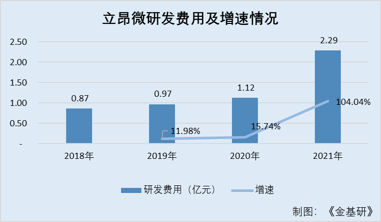 据东方财富Choice数据,2018-2021年,立昂微的研发费用分别为0.87亿元、0.97亿元、 1.12亿元、2.29亿元。2019-2021年,研发费用的增速分别为11.98%、15.74%、104.04%。