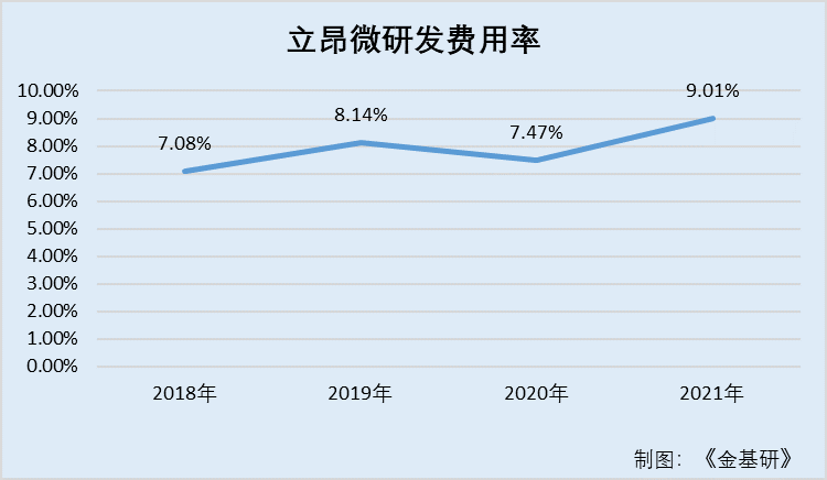 2018-2021年,立昂微的研发费用率分别为7.08%、8.14%、7.47%、9.01%,其研发费用率总体呈上升的趋势。