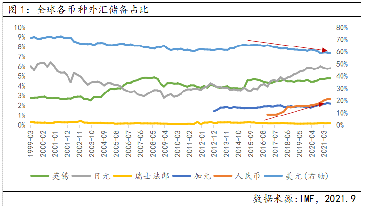从外汇储备来看,国际货币基金组织最新公布的数据显示,2021年三季度美元在全球外汇储备中所占份额为59%已降至近26年以来的最低水平。相比在1977年至1991年期间,美元在全球外汇储备中的占比一度高达85%,跌幅达30%。