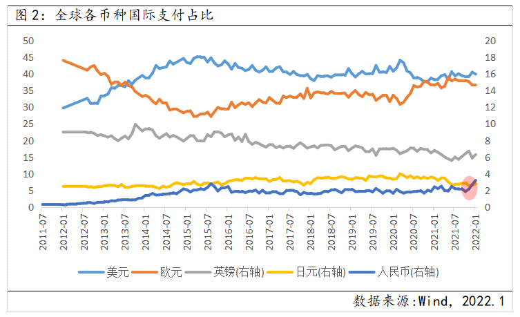 而在这一过程中,我国作为世界第一贸易大国,人民币成为了越来越来越多贸易伙伴的计价或结算货币。最近的一则消息称,沙特正在考虑将其向中国出售的部分石油以人民币计价。从SWIFT数据来看,近几个月来人民币在国际支付中的占比提升显著,从2021年8月1.85%快速提升了1.35个百分点至2022年1月的3.2%,但对比美元、欧元的39.92%和36.56%仍相距甚远。不可否认的是,在短期内美元依然稳坐世界主要货币的位置,但随着多国开始考虑转用人民币进行国际贸易结算,并反过来激励他们持有人民币外汇储备,如此正向循环无疑将加速推动人民币的国际化进程。
