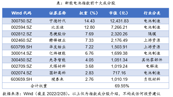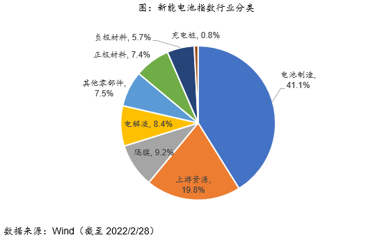 新能电池指数成分股中电池制造企业权重占比最高(41.1%);上游材料企业(正极+负极+隔膜+电解液)权重占比合计高达30.7%;此外,上游资源企业权重占比也达到了19.8%。