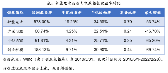 基日以来,新能电池指数累计收益率为1696.19%,年化收益率16.79%。而通过可比数据,自2010年6月1日以来,新能电池指数累计收益率为578.00%,年化收益率18.25%,夏普比率0.70;均高于沪深300指数、中证500指数以及创业板指。