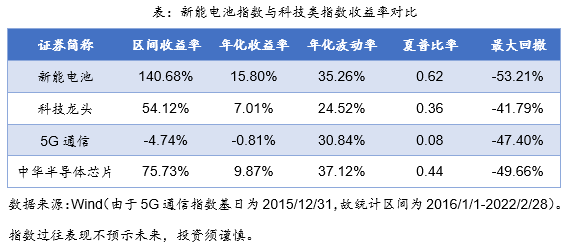 在与市场科技类指数进行对比后发现,自2016年以来,新能电池指数累计收益率140.68%,年化收益率15.80%,领先同期5G指数、科技龙头指数以及中华半导体芯片指数。