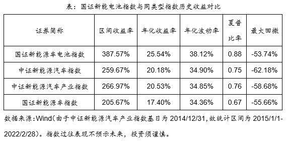 另一方面,在与新能源车同类型指数对比后发现,国证新能电池指数历史表现也领先其他同类型指数。自2015年至2022年2月28日,国证新能电池指数累计收益率为387.57%,年化收益率25.54%,夏普比率高达0.88,领先其他同类新能源车指数。