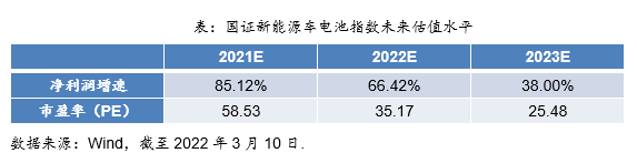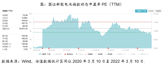 截至2022年3月10日收盘,国证新能电池指数动态市盈率PE(TTM)为73.58倍,位于指数近两年来9.28%历史分位数。国证新能源车电池指数的估值或将被其高利润增速所消化。根据Wind预测数据,该指数在2022年、2023年的净利润增速将分别达到66.42%和38.00%,对应市盈率(PE)将降至35.17倍和25.48倍。长期来看,国证新能源车电池指数或仍然具有相当高的投资价值。
