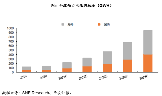 除储能行业的应用外,电池系统还是新能源车中成本占比最高的部件,其成本占比接近40%。随着新能源车的普及,动力电池行业规模预计将快速增长。2020年全球动力电池装机量为139GWH, SNE Research预测全球动力电池装机量在2025年将达到940GWH,2020-2025年复合增速超过45%。