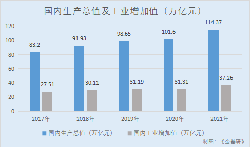 2017-2021年,国内生产总值分别为83.2万亿元、91.93万亿元、98.65万亿元、101.6万亿元、114.37万亿元;国内工业增加值分别为27.51万亿元、30.11万亿元、31.19万亿元、31.31万亿元、37.26万亿元。