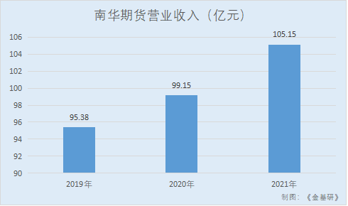 2019-2021年,南华期货的营业收入分别为95.38亿元、99.15亿元、105.15亿元。