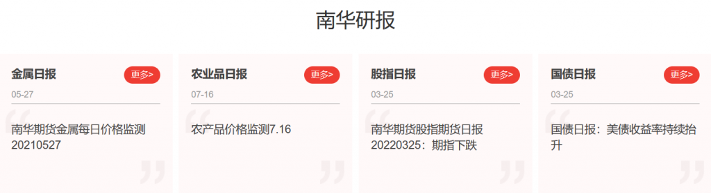 自成立以来,南华期货定期推出对于宏观经济、农产品、能源化工品、金属产品、金融产品、风险管理等方面的研究报告,报告以实战策略为导向,及时地向客户揭示市场中存在的投资机会。
