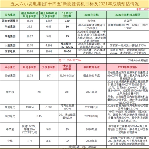 在“双碳”目标下,新能源装机规模有望大幅提升,而除了纯粹的新能源运营商,传统电力运营企业向新能源转型也大有可为。根据我国主要发电企业公布的新能源装机目标,“十四五”期间五大六小发电集团预计新增新能源装机规模550-590GW。随着传统电力运营商快速转型,新能源装机规模的提升不仅能带动传统电力运行商业绩增长,同时还能对其企业估值起到较大的提升作用。