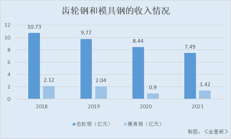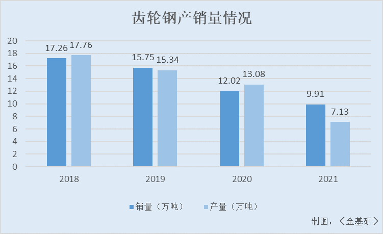 据2020年招股书、2019年、2020年和2021年年报,2018-2021年,齿轮钢的产量分别为177,553.39吨、153,375.27吨、130,797.73吨、71,328.99吨,销量分别是172,604.81吨、157,541.93吨、120,224.09吨、99,101.63吨。
