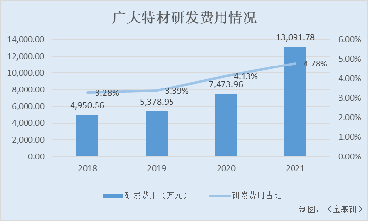 2018-2021年,广大特材的研发费用分别为4,950.56万元、5,378.95万元、7,473.96万元、13,091.78万元,占营业收入比例分别为3.28%、3.39%、4.13%、4.78%。
