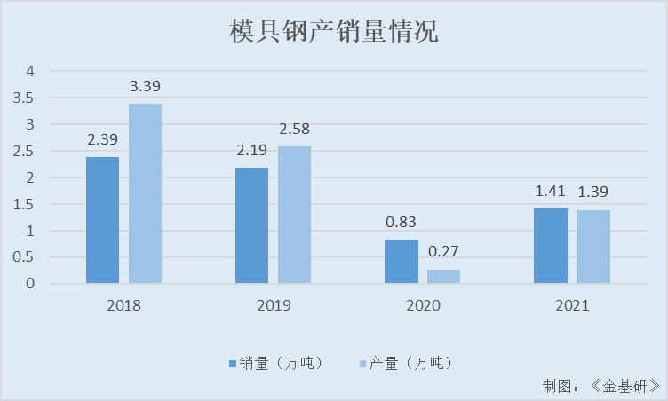 2018-2021年,模具钢的产量分别为33,929.8吨、25,777.65吨、2,670.66吨、13,944.79吨,销量分别是23,927.31吨、21,926.57吨、8,255.68吨、14,124.29吨。