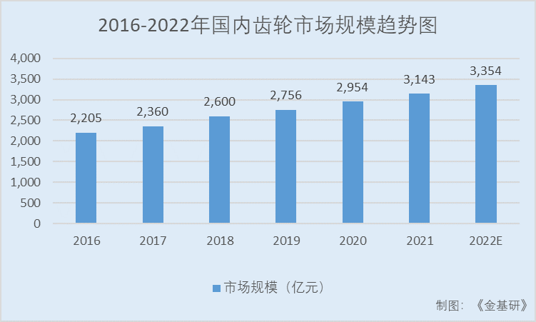 齿轮行业产品广泛应用于制造装备领域,齿轮行业与国民经济发展密切相关,整体而言,行业增长与国民经济周期基本保持一致。同时,考虑到齿轮行业本身具有技术密集型和资金密集型的特点。整个齿轮行业,已从高速发展期过渡到平稳发展期。预计2022年国内齿轮市场规模将达3354亿元。