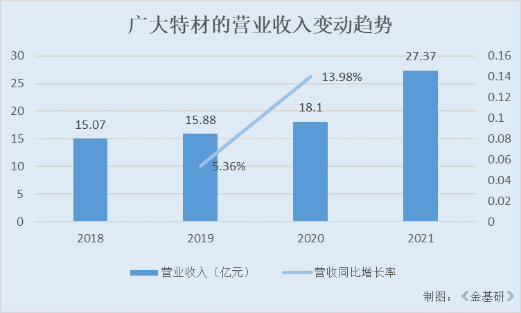 据东方财富Choice数据,2018-2021年,广大特材的营业收入分别为150,746.89万元、158,829.78万元、181,033.78万元、273,728.03万元,2019-2021年分别同比增长5.36%、13.98%、51.2%,营业收入逐年增长。