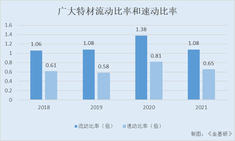 2018-2021年,广大特材流动资产分别为17.2亿元、15.42亿元、22.17亿元、37.38亿元。同期,广大特材流动比率分别为1.06倍、1.08倍、1.38倍、1.08倍,速动比率分别为0.61倍、0.58倍、0.81倍、0.65倍。