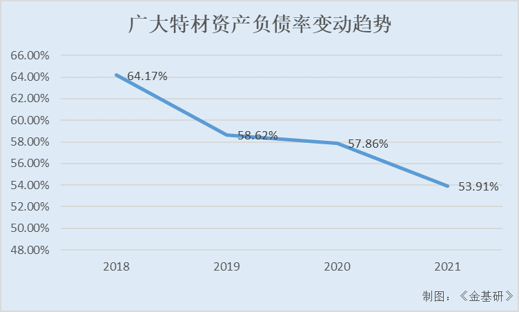 同时,2018-2021年,广大特材的资产负债率分别为64.17%、58.62%、57.86%、53.91%。