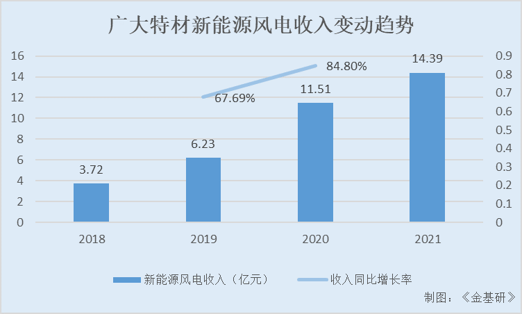 2018-2021年,广大特材新能源风电实现的收入分别为3.72亿元、6.23亿元、11.51亿元、14.39亿元,2019-2021年分别同比增长67.69%、84.8%、24.96%。