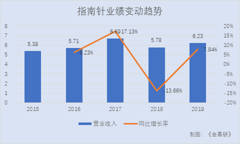 据同花顺iFinD数据,2015-2019年,指南针的营业收入分别为5.39亿元、5.71亿元、6.69亿元、5.78亿元、6.23亿元,2016-2019年分别同比增长6.08%、17.13%、-13.66%、7.84%。